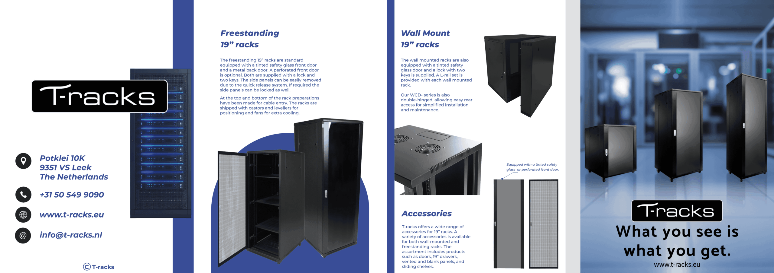 T-racks was founded because of the customers demand to provide a simple and fast way to securely store audio hardware. For this reason, Tau has decided to offer 19 inch racks that consist not only of all components, but are also fully assembled. In addition, delivery times often proved to be a problem. For this reason, Tau has made sure all the cabinets are in stock. As a result, we can have the cabinet delivered the next working day after ordering. Our racks are not only perfect for audio products but also for IT, video and security products. T-racks is the best solution for 19″ wall mounted and freestanding cabinets!